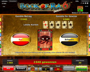 Haben Sie bei Book of Ra gewonnen, können Sie den Gewinn annehmen, wenn Sie kein Risiko mehr eingehen wollen. Sie können jedoch auch auf Risiko spielen und dafür auf die Schaltfläche Gamble klicken. Beim Risiko müssen Sie raten, welche Farbe eine verdeckte Karte hat, um Ihren Gewinn zu verdoppeln. Haben Sie gewonnen, können Sie den Gewinn annehmen, doch können Sie auch noch mehrmals weiterzocken. Raten Sie die falsche Kartenfarbe, ist Ihr Gewinn verloren, Sie gehen leer aus, die Funktion ist beendet.